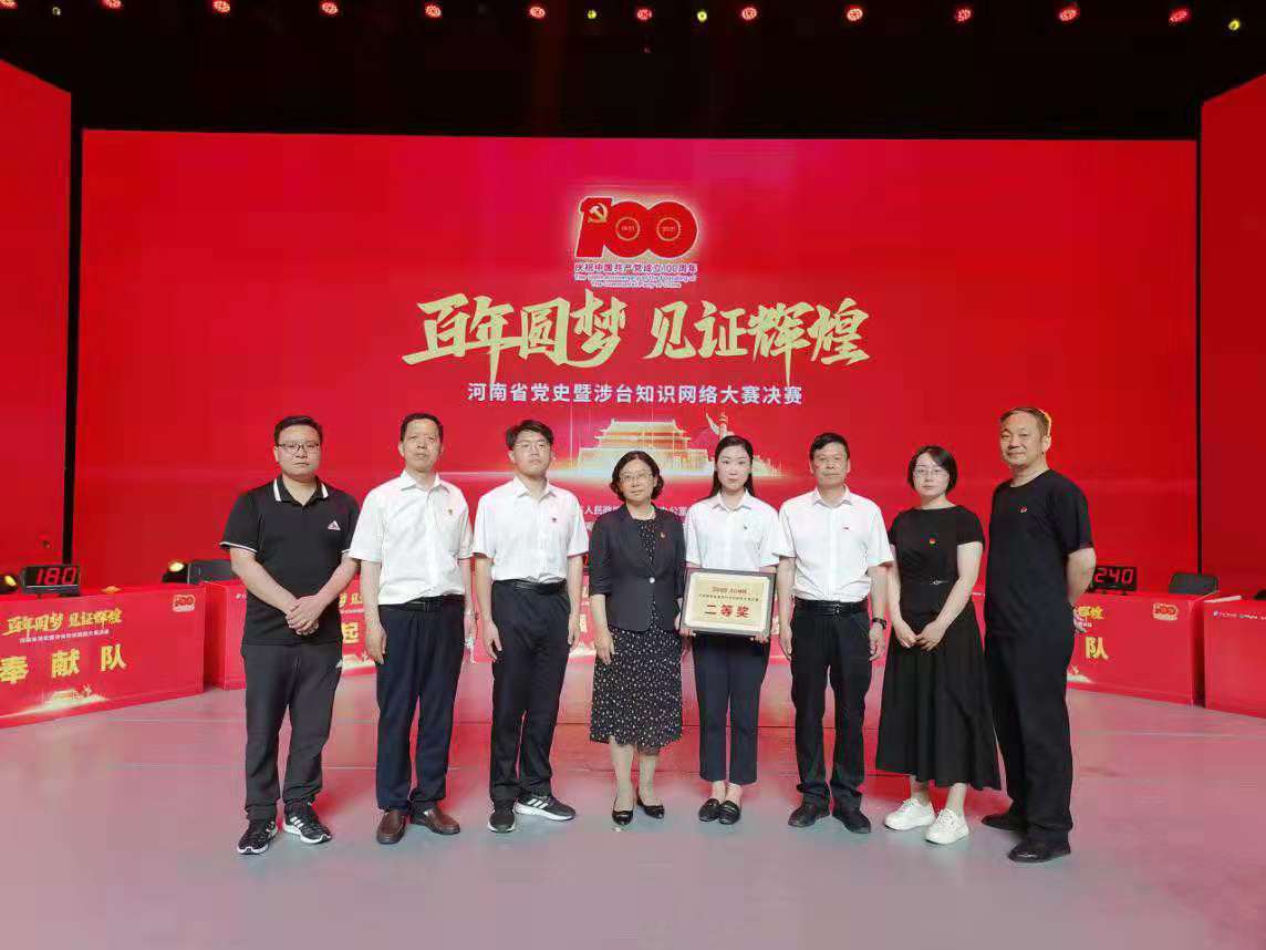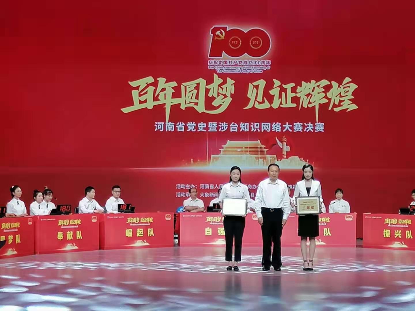 5月25日,由河南省台办、河南广播电视台主办,东方今报·猛犸新闻承办的“百年圆梦 见证辉煌”2021年河南省党史暨涉台知识网络大赛决赛暨颁奖典礼在河南广播电视台举行,我市代表队在次此活动中荣获二等奖,河南省委常委、统战部部长孙守刚亲自为我市代表队颁奖并合影。