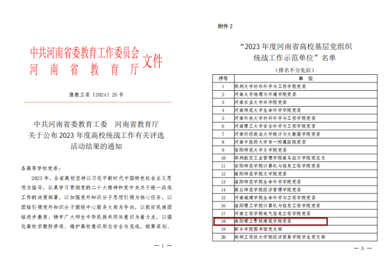 近日,中共河南省委教育工委、河南省教育厅下发《中共河南省委教育工委 河南省教育厅关于公布 2023 年度高校统战工作有关评选活动结果的通知》(豫教工委〔2024〕25号),建筑学院党委获批“2023年度河南省高校基层党组织统战工作示范单位”称号。全省共评选表彰30家基层党组织统战工作示范单位。