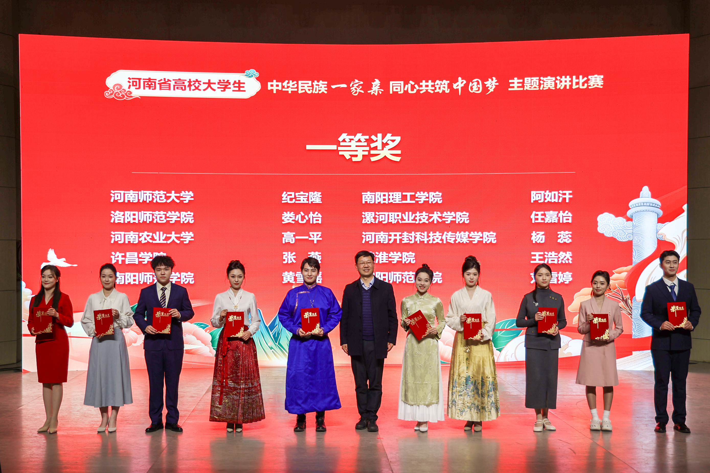 12月4日,由中共河南省委教育工委、省教育厅主办,河南师范大学承办的全省高校大学生“中华民族一家亲,同心共筑中国梦”主题演讲比赛决赛在河南师范大学帕瓦罗蒂音乐厅举行。我校传媒学院学生阿如汗凭借扎实的专业功底和出色的舞台表现脱颖而出,斩获一等奖!